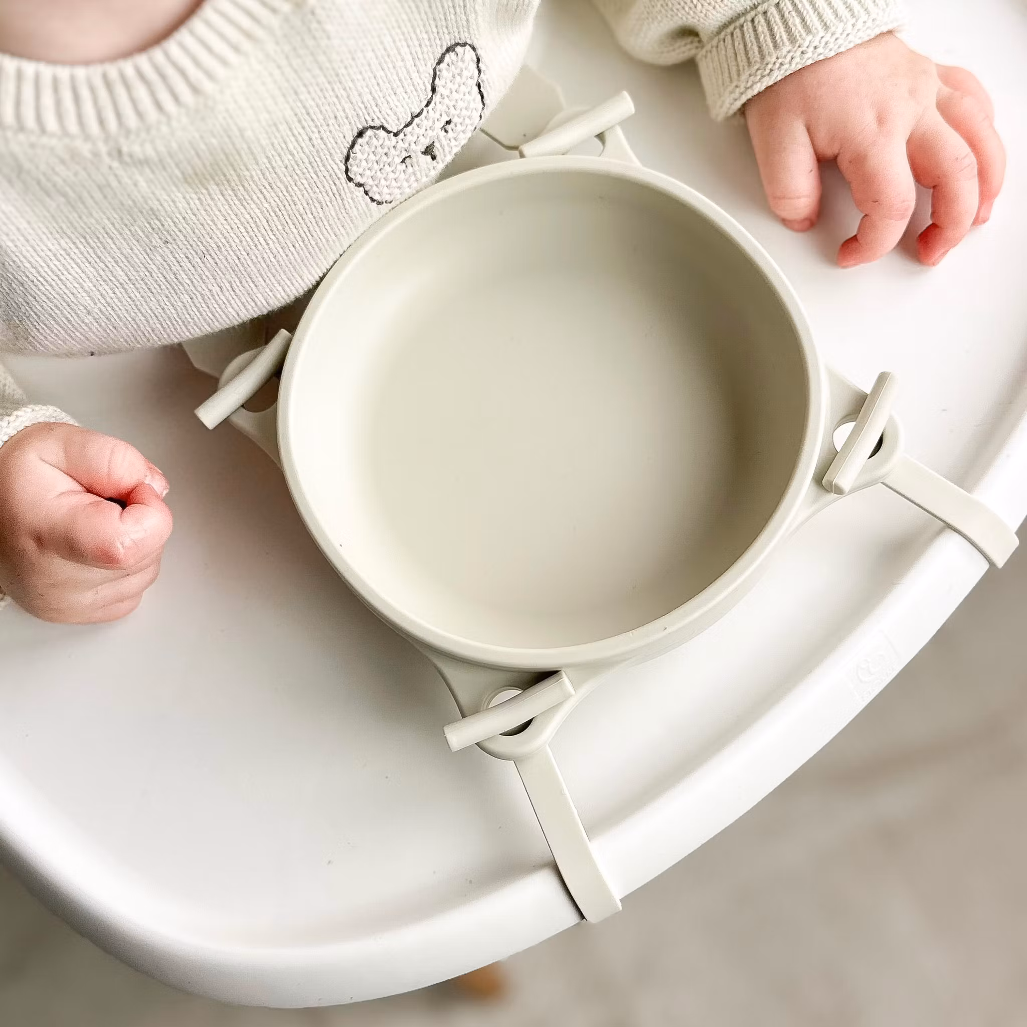 For optimal durability and to prevent food stains, rinse the products after use. Avoid using sharp objects directly on the silicone. The straps are designed as a practical aid to keep the products in place during meals and are not intended for playing or chewing.